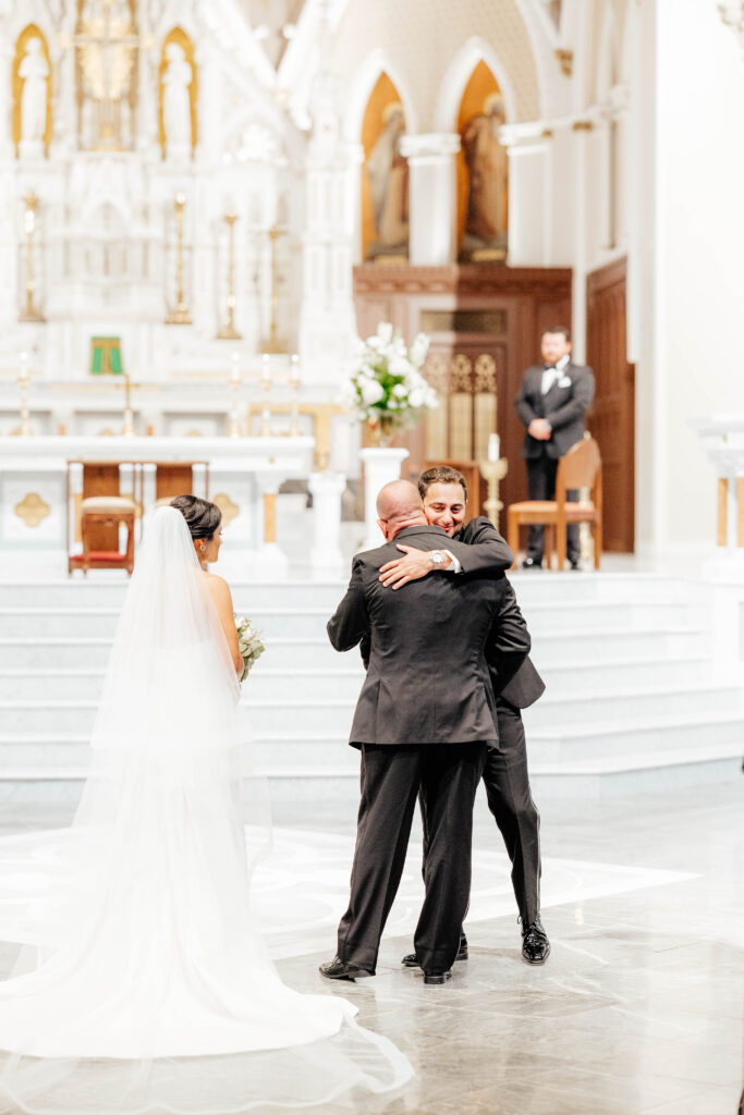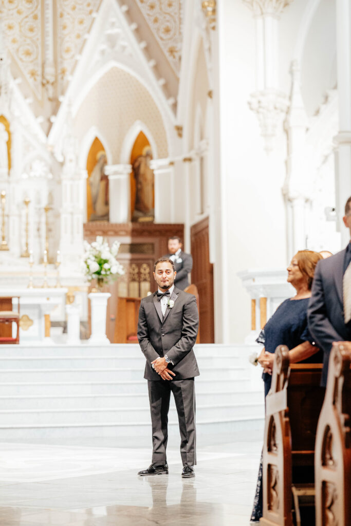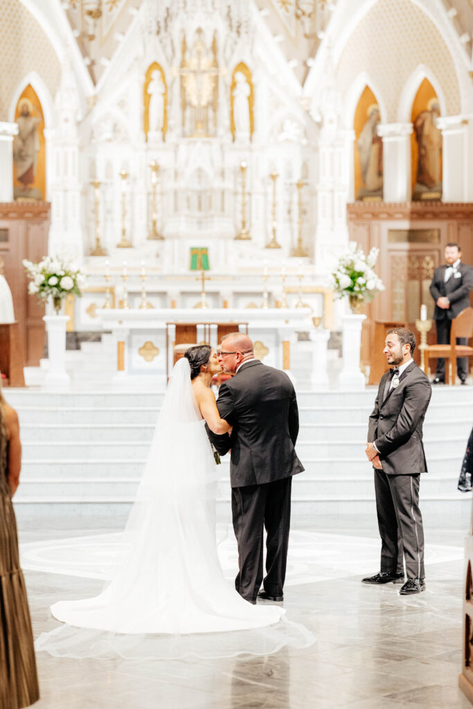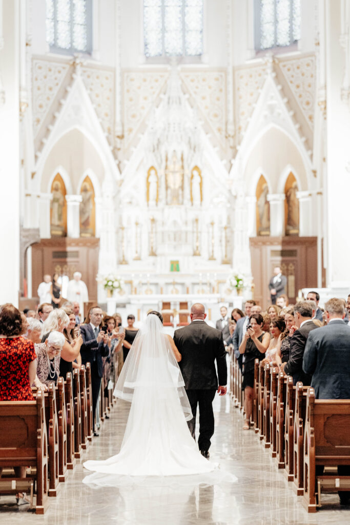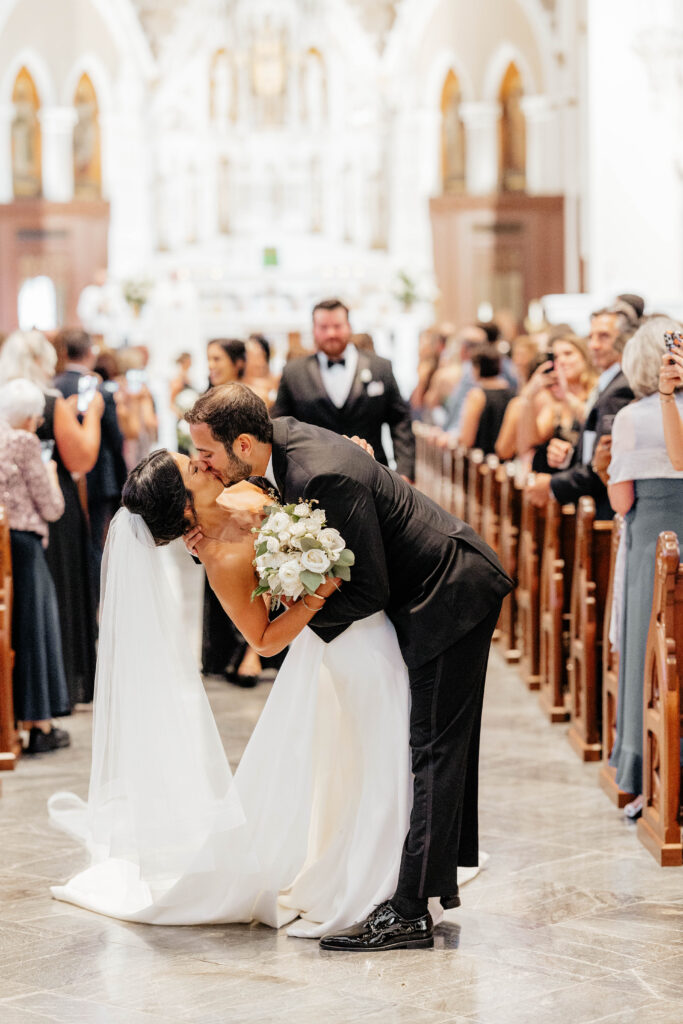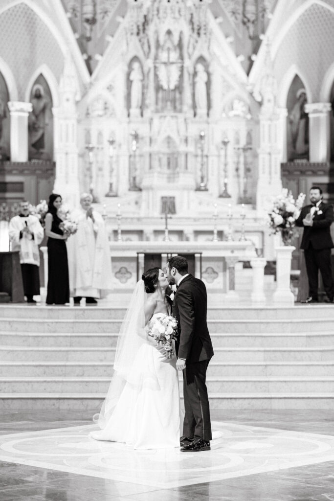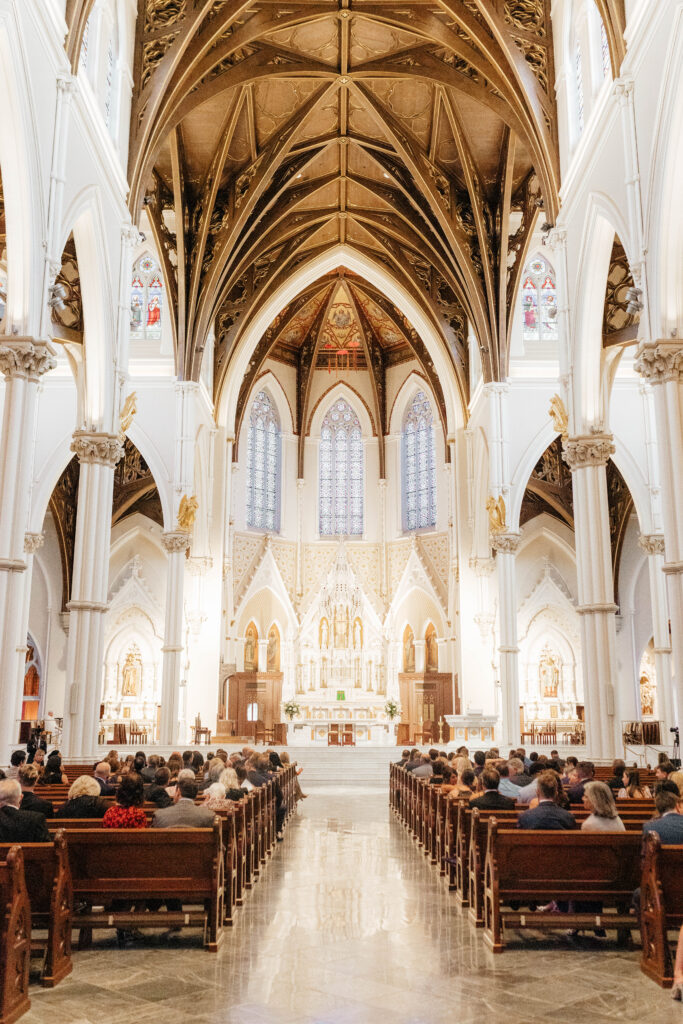 First, Kristin and Jesús begin their wedding day with a traditional Catholic ceremony at the Cathedral of the Holy Cross. This iconic Boston church features soaring ceilings and intricate architectural details. As guests take their seats, soft light fills the space and sets a reverent tone. Soon after, Kristin walks down the aisle in a dress that feels modern, timeless, and effortlessly chic. In that moment, the ceremony feels emotional and deeply personal.