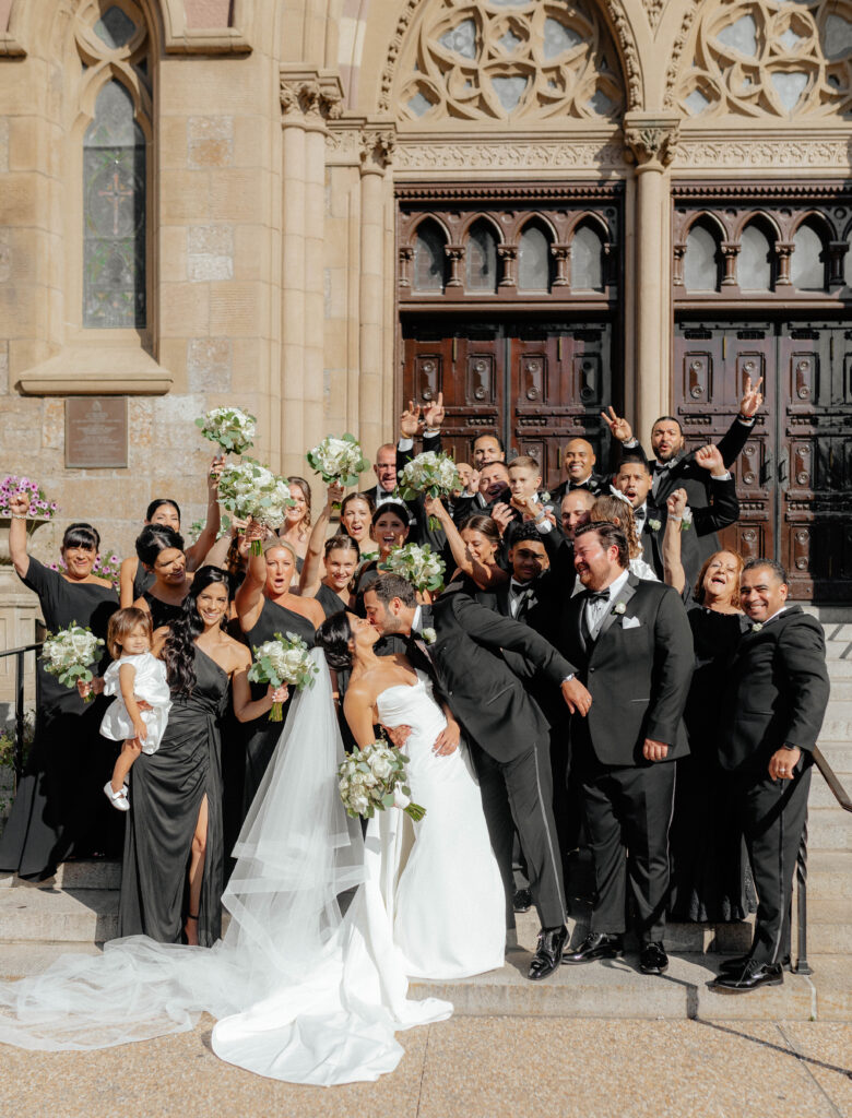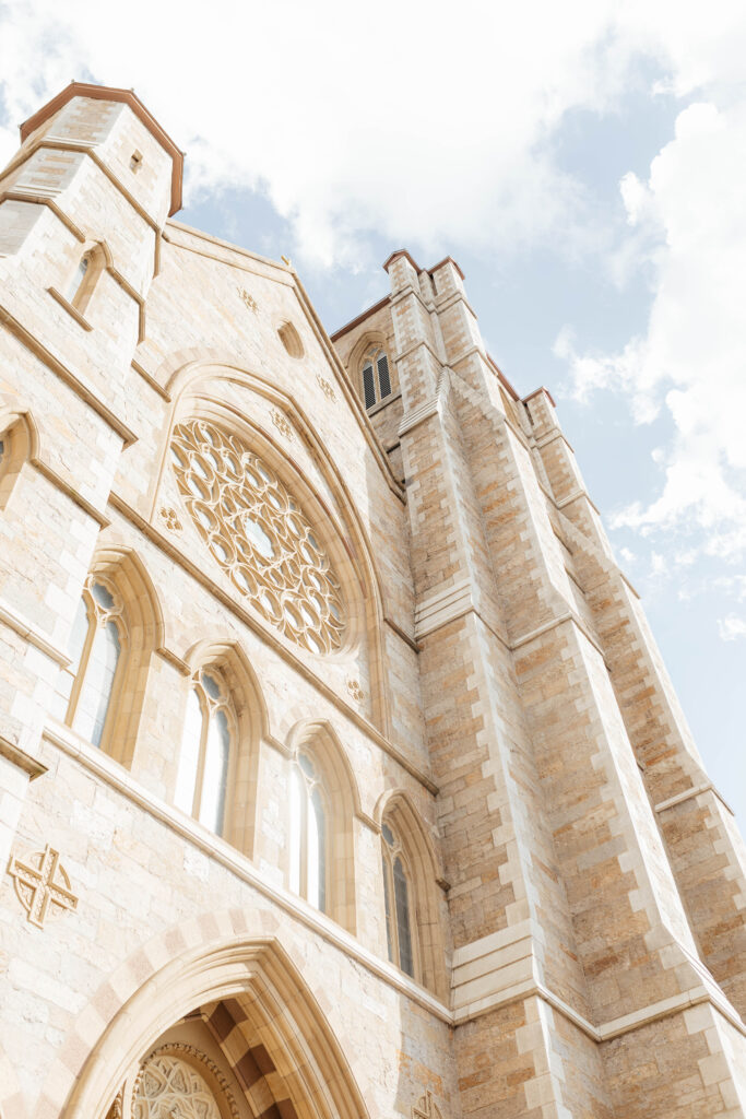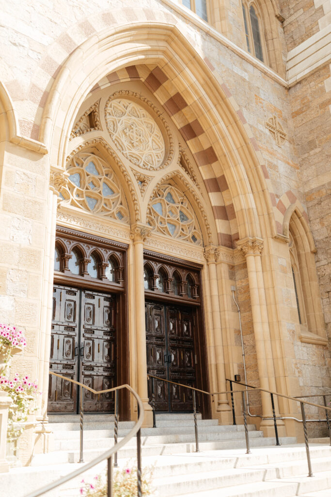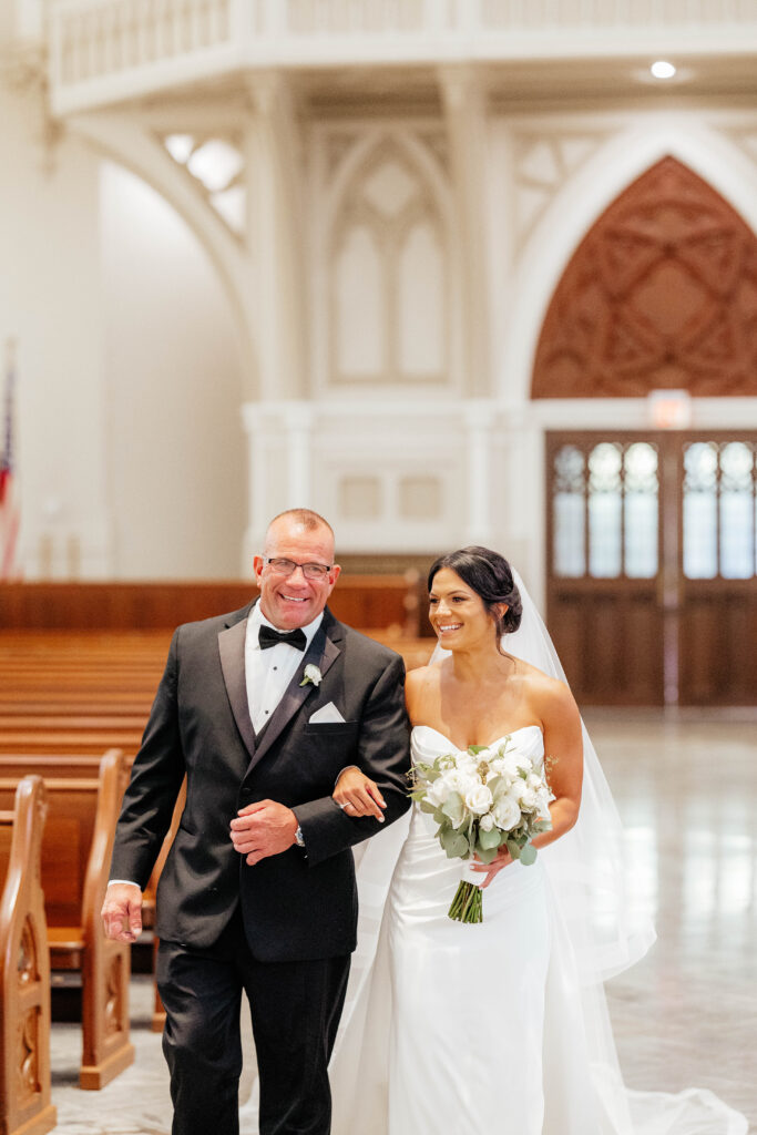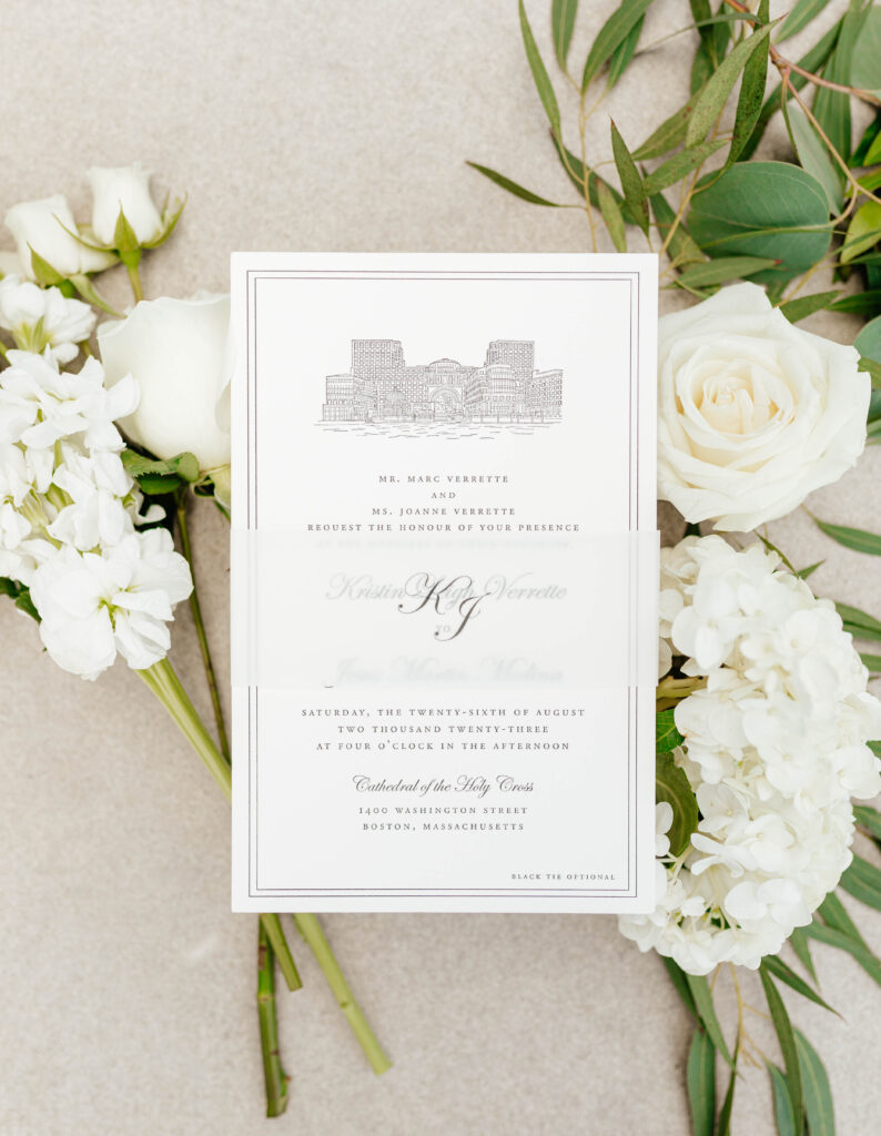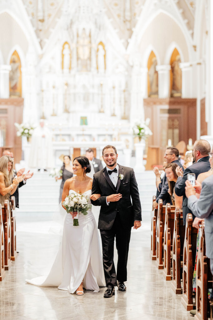 First, Kristin and Jesús begin their wedding day with a traditional Catholic ceremony at the Cathedral of the Holy Cross. This iconic Boston church features soaring ceilings and intricate architectural details. As guests take their seats, soft light fills the space and sets a reverent tone. Soon after, Kristin walks down the aisle in a dress that feels modern, timeless, and effortlessly chic. In that moment, the ceremony feels emotional and deeply personal.