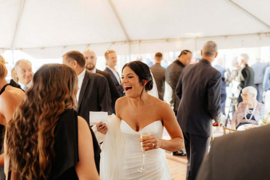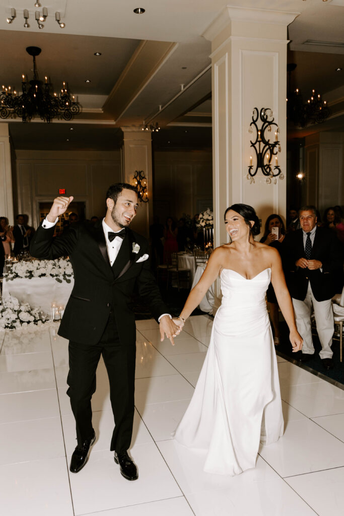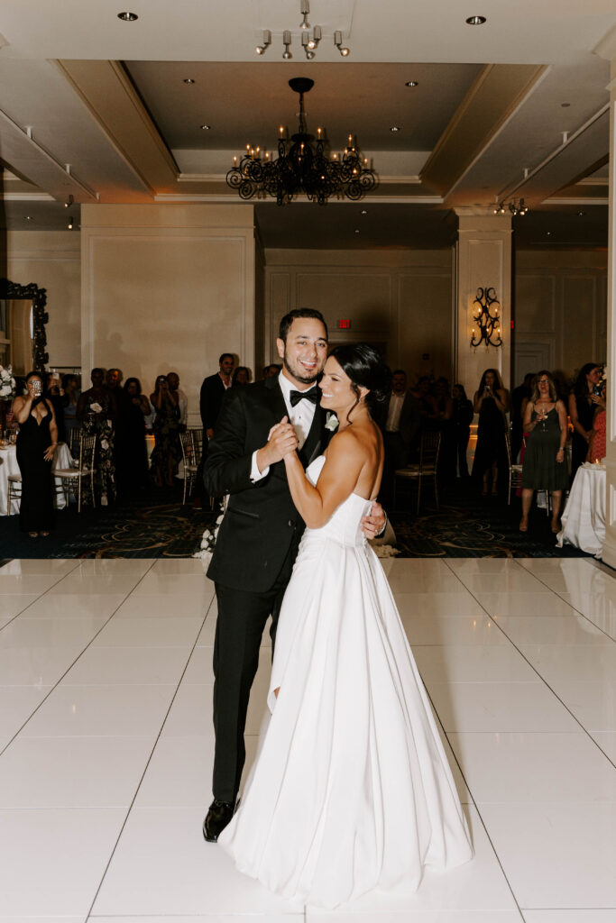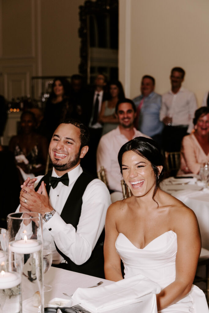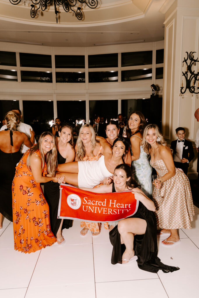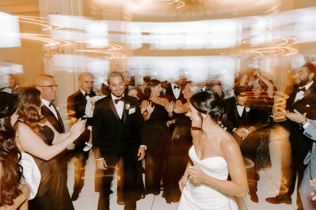 Next, the reception begins in the hotel’s elegant ballroom. The space feels refined yet full of energy. As the night continues, heartfelt toasts bring laughter and happy tears. Shortly after, the dance floor fills and stays lively all evening. Because of the vibrant atmosphere, the celebration feels fast paced, joyful, and distinctly Boston.