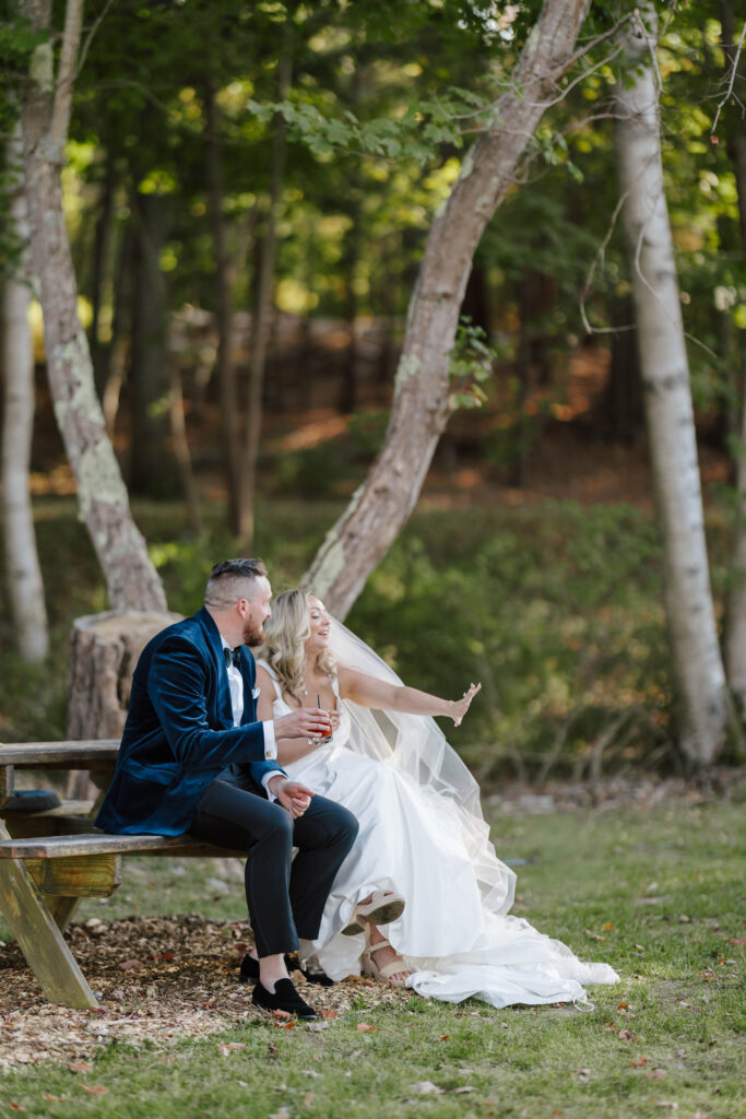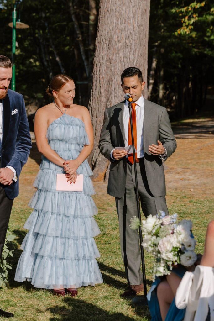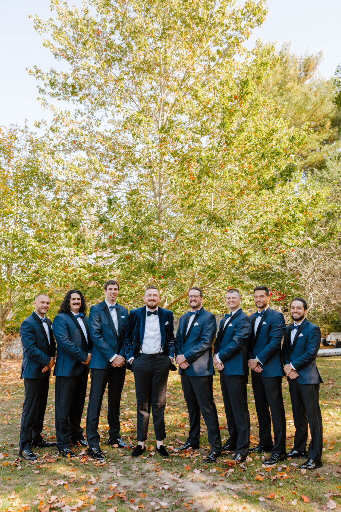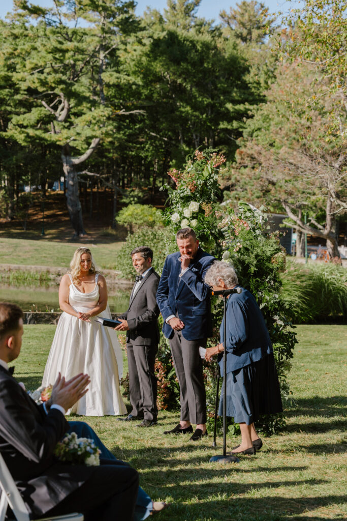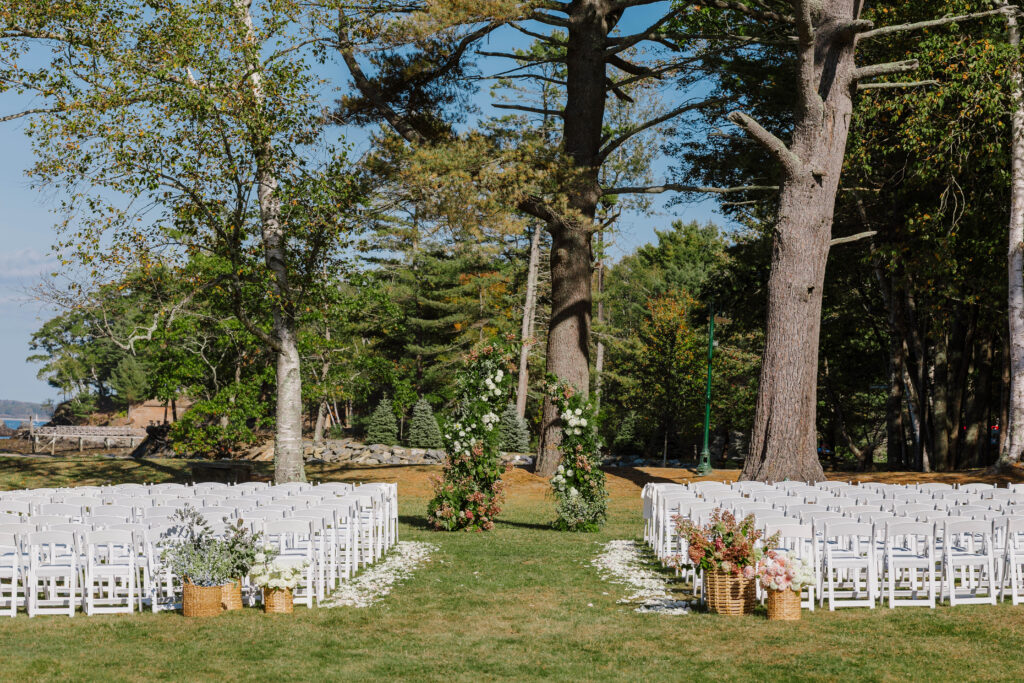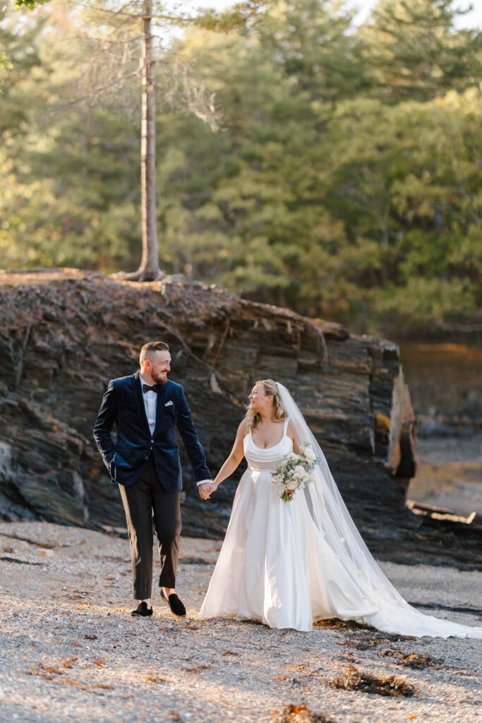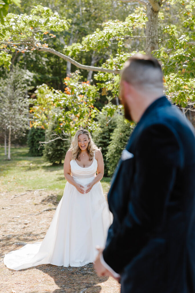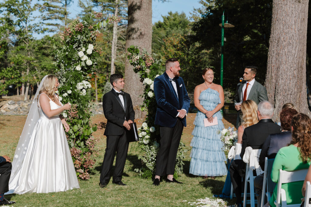Mallory and Eric shared their first look at the Point, surrounded by trees with the softest golden light filtering through. It was one of those quiet, beautiful moments that set the tone for the whole day. From there, guests gathered at the Great Diamond Island Inn for a ceremony that felt both timeless and intimate — with ocean views and a gentle fall breeze.
