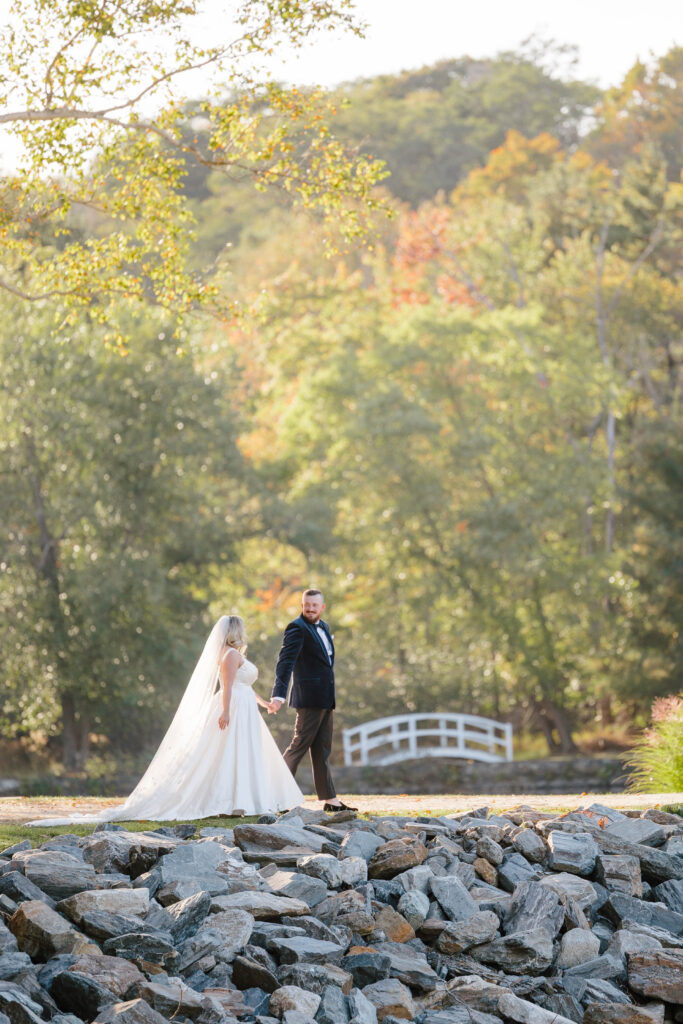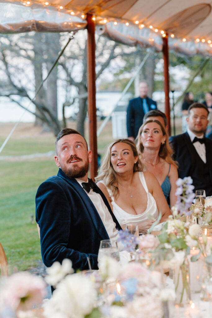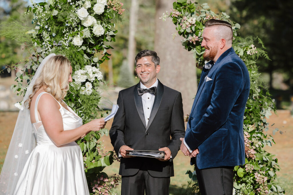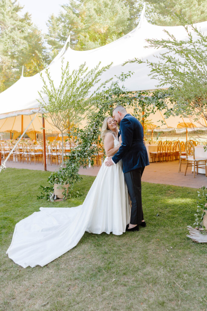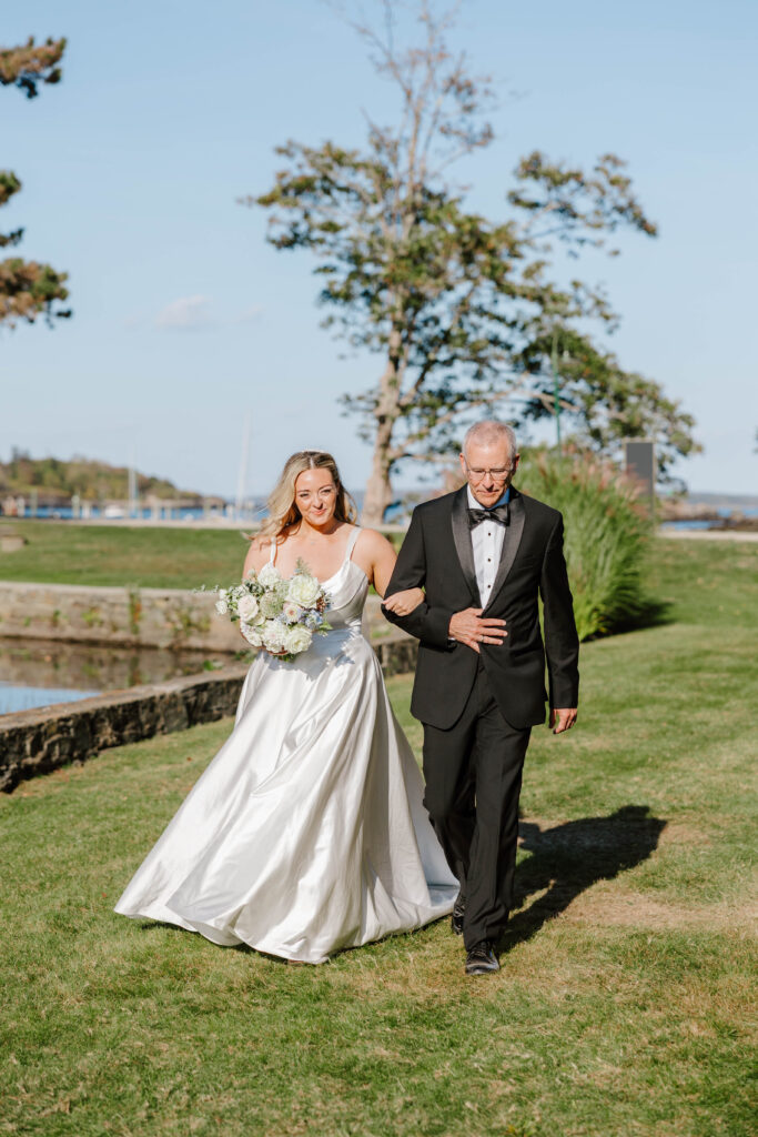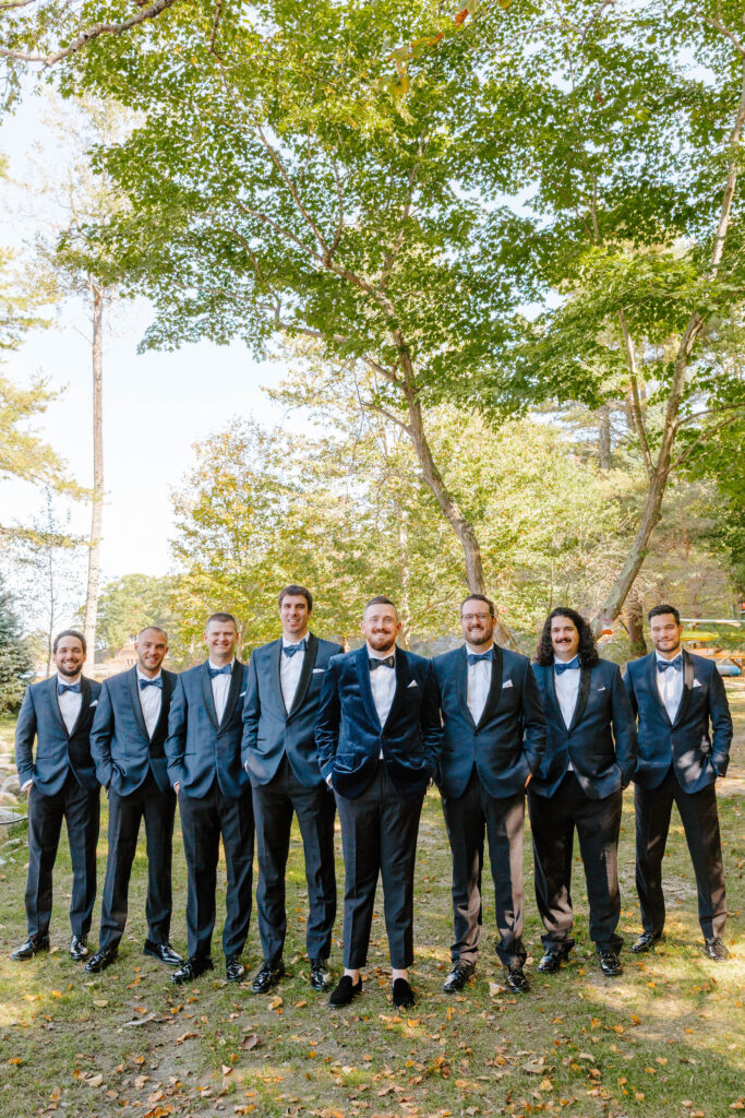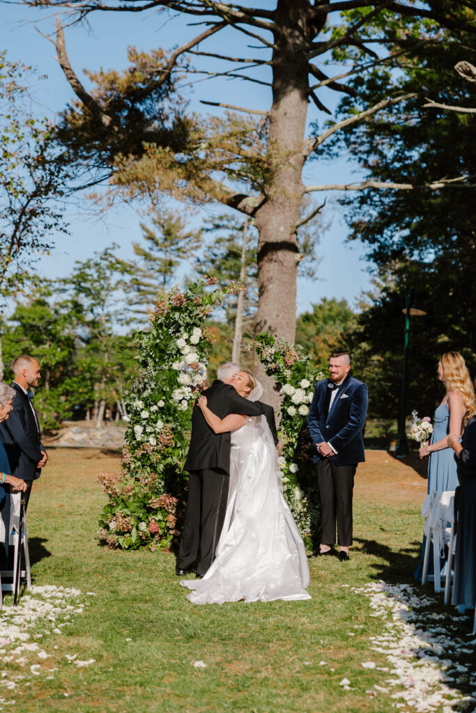 Mallory and Eric shared their first look at the Point, surrounded by trees with the softest golden light filtering through. It was one of those quiet, beautiful moments that set the tone for the whole day. From there, guests gathered at the Great Diamond Island Inn for a ceremony that felt both timeless and intimate — with ocean views and a gentle fall breeze.
