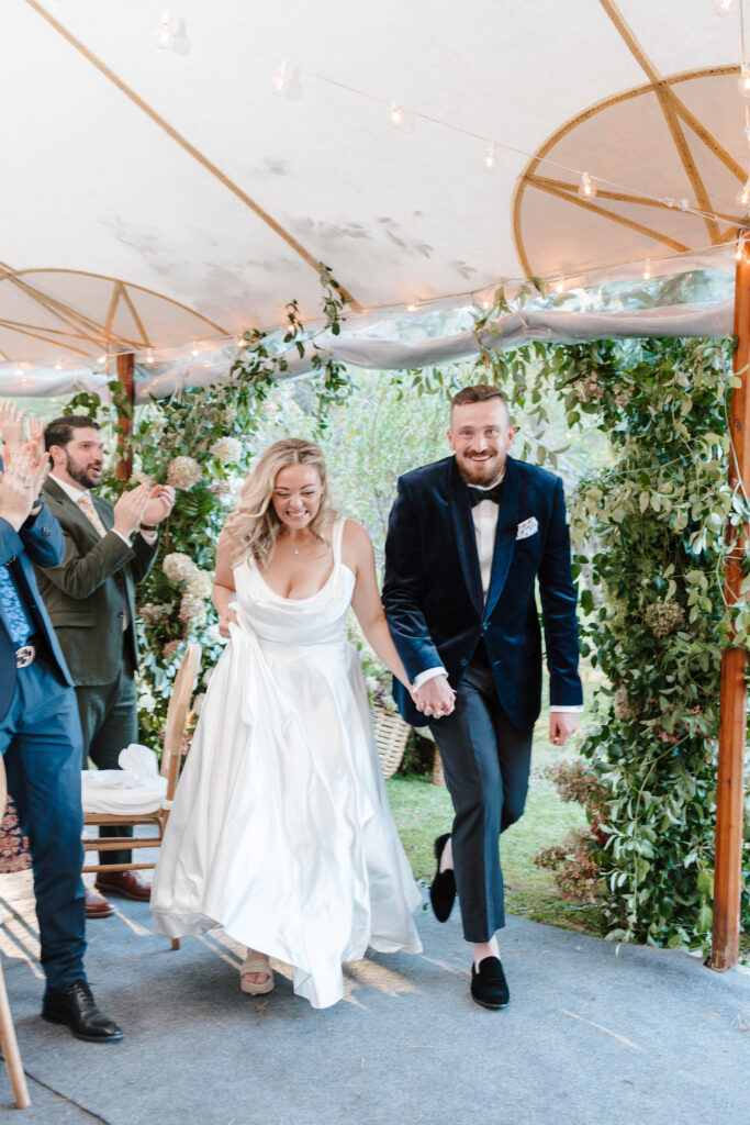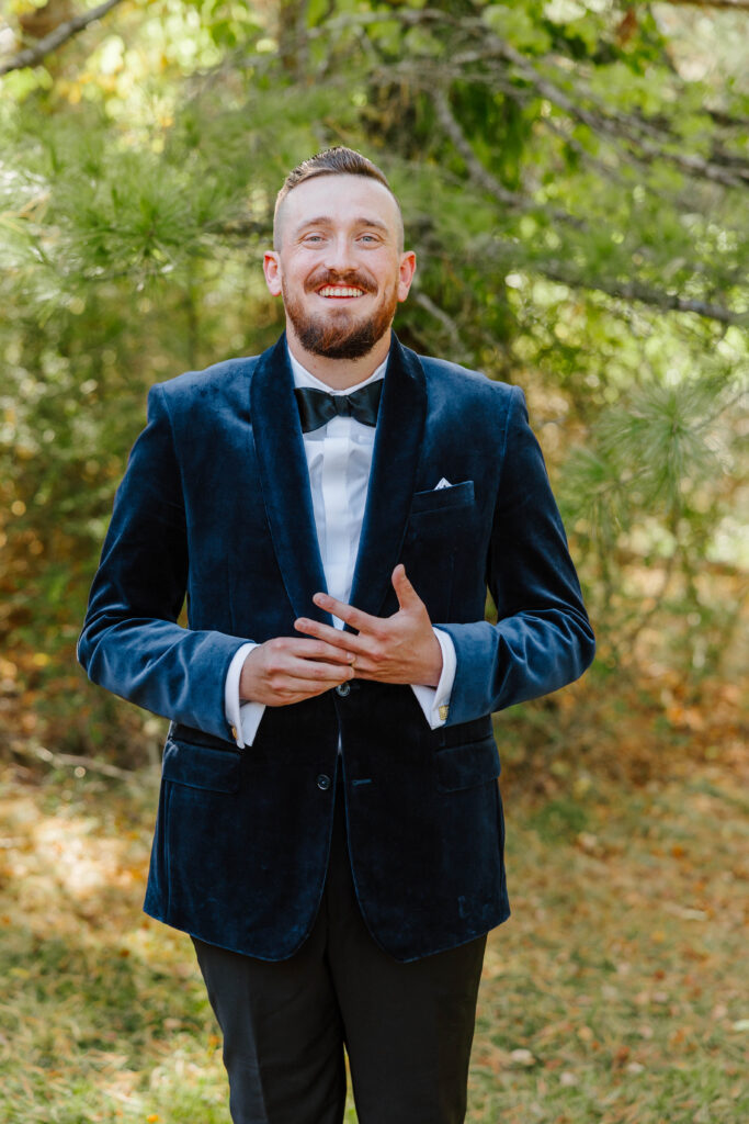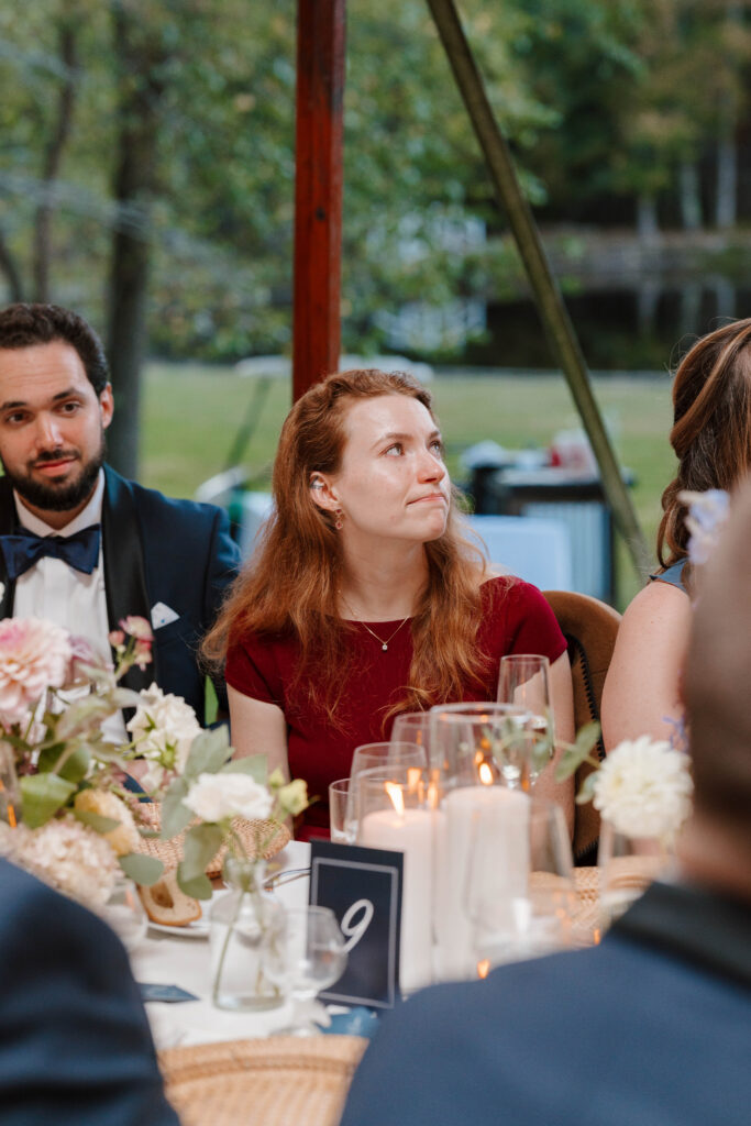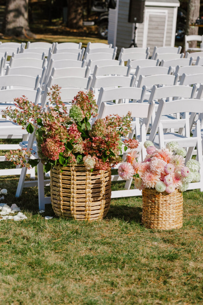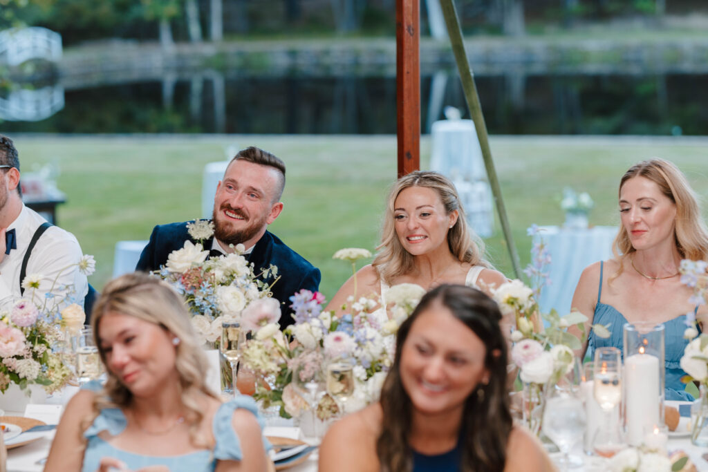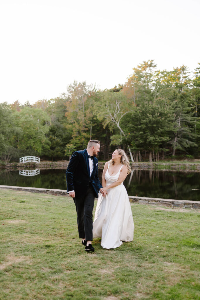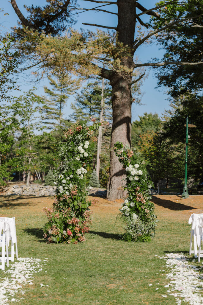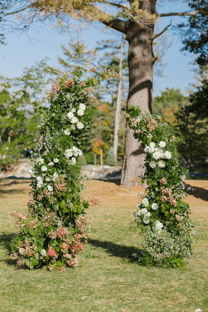 Mallory and Eric shared their first look at the Point, surrounded by trees with the softest golden light filtering through. It was one of those quiet, beautiful moments that set the tone for the whole day. From there, guests gathered at the Great Diamond Island Inn for a ceremony that felt both timeless and intimate — with ocean views and a gentle fall breeze.