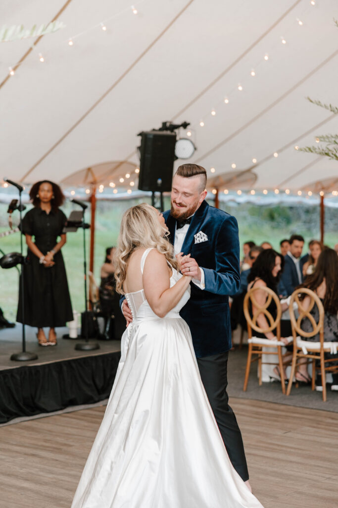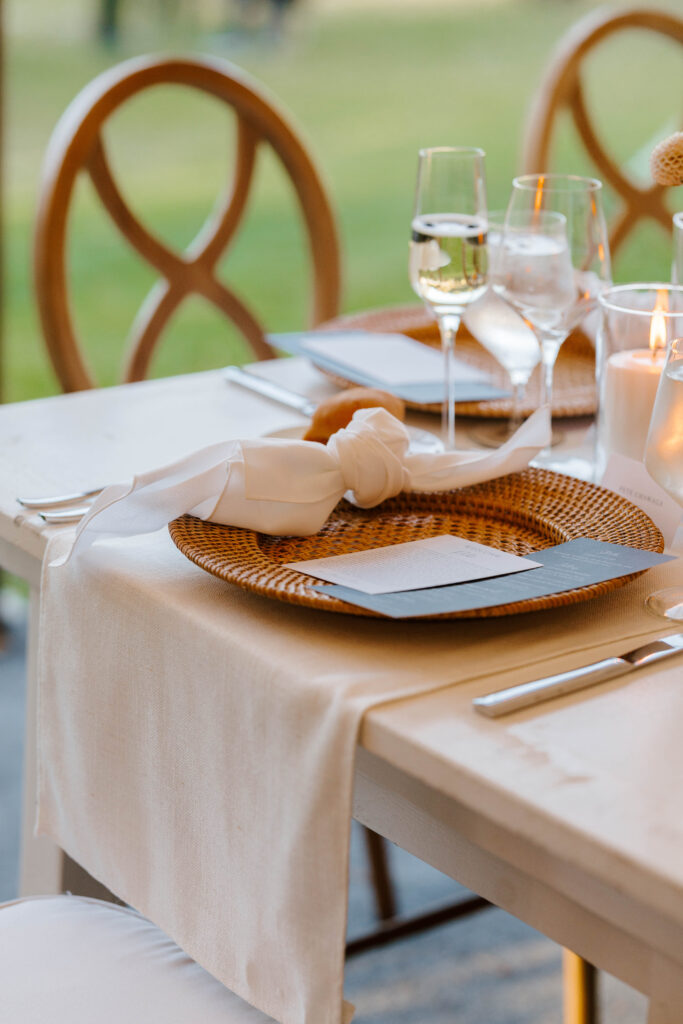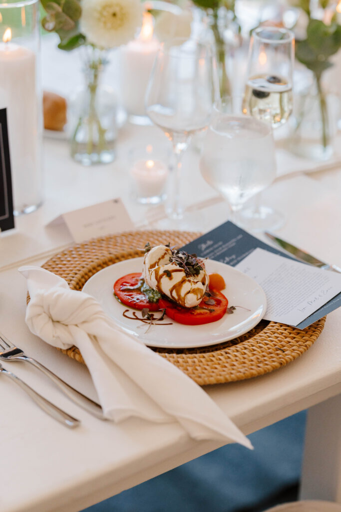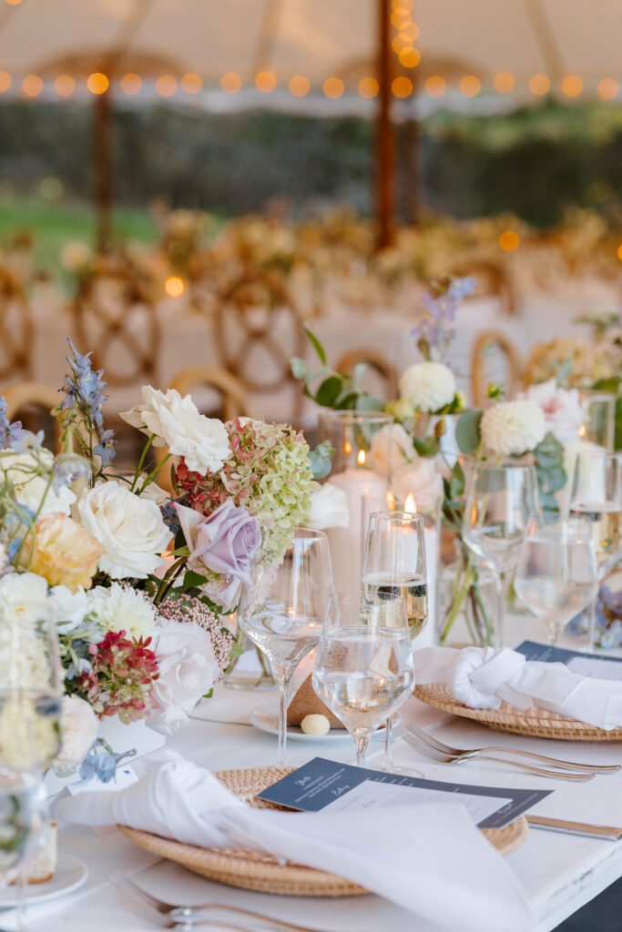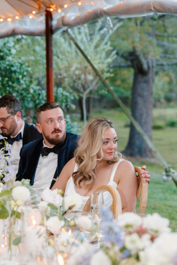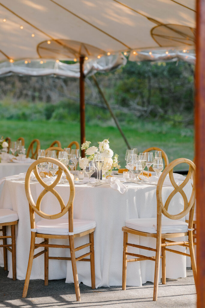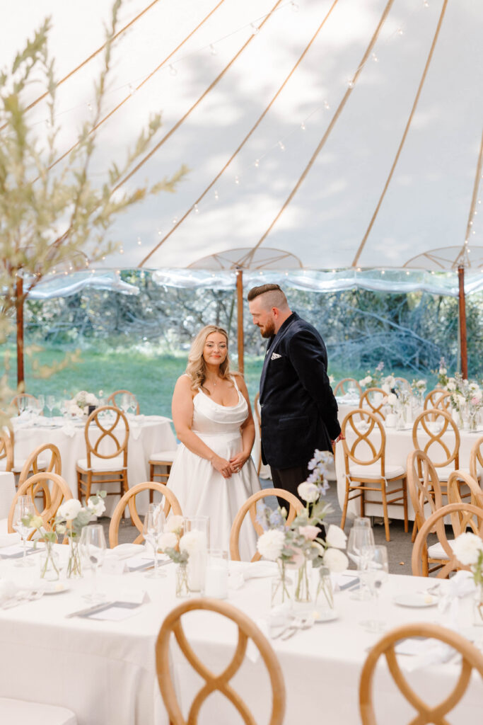 During cocktail hour, guests sipped from The Roaming Speakeasy — a stylish mobile bar serving beer on tap and craft cocktails that perfectly fit the laid-back island vibe. Laughter carried through the air as everyone mingled under the trees before moving to the tented reception space that had been completely transformed with elegant seating, lush florals, and rows of glowing candles.