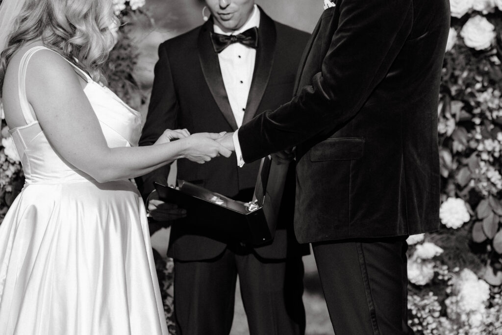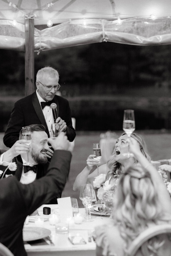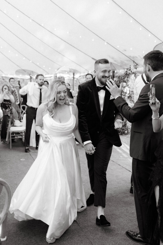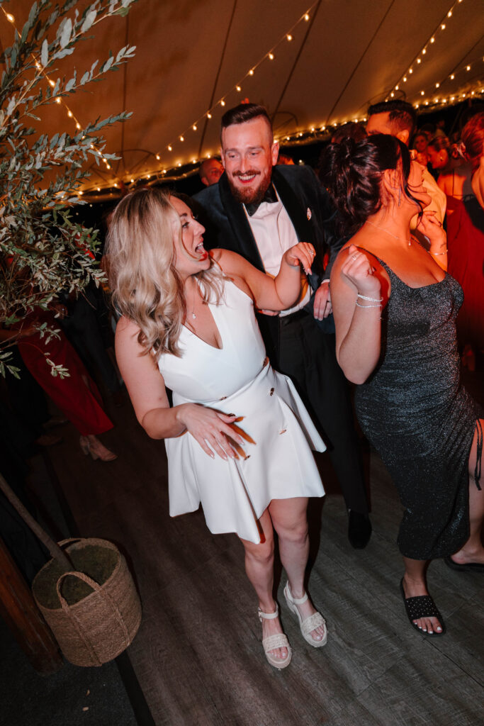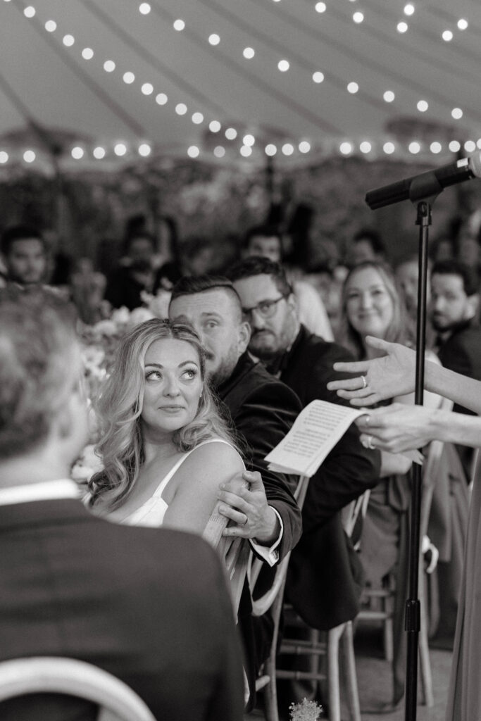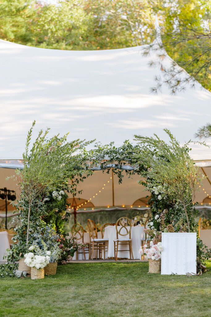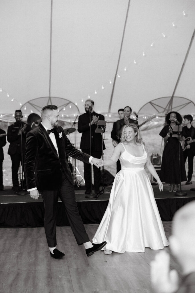 During cocktail hour, guests sipped from The Roaming Speakeasy — a stylish mobile bar serving beer on tap and craft cocktails that perfectly fit the laid-back island vibe. Laughter carried through the air as everyone mingled under the trees before moving to the tented reception space that had been completely transformed with elegant seating, lush florals, and rows of glowing candles.